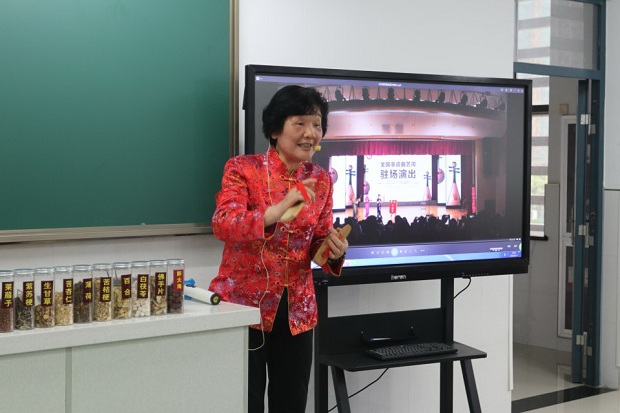 正当我们还沉浸在激动中时,76岁高龄的叶莉莉老师却换了一身唐装精神矍铄的出现在了3楼的烹饪教室。一句“小宝贝们好!”瞬间就拉近了和学生们的距离。她绘声绘色地向学生讲述了“梨膏糖”的由来,据说和唐朝年间宰相魏征的孝敬母亲有关。她说“梨膏糖是一项传统食品,是用雪梨汁、苦桔梗、白茯苓、生甘草等中药,按比例加糖熬制成汁,再凝固成形的糖块。它具有清喉润肺、止咳化痰、清咽利嗓等功效……”叶老师和她是团队现场演示了“梨膏糖”制作过程,并让学生亲手体验、包装成盒带回家去孝敬父母长辈。乘着熬汤的间隙,叶老师拿出了小鼓、锣、莲花板唱起了“小热昏”。叶老师说,常州“小热昏”是伴随着售卖梨膏糖而产生的传统说唱艺术,已有百余年历史,在过去的数十年期间曾兴盛一时,2010年被确立为国家级非物质文化遗产。自古卖梨膏糖的艺人“三分卖糖,七分卖唱”,以期宣传梨膏糖所用草药的功效。接着叶老师让学生们在熟悉了快板的节奏后,学生们趣味盎然的也跟着唱起来了“小热昏”。学生们与叶老师积极互动,现场氛围极其热烈。平时不善言辞的学生居然主动走到叶老师跟前说:“叶奶奶,您下次什么时候来呀,我也想学制梨膏糖,亲手包好了,送给我奶奶,我奶奶她也咳嗽的。”学生在潜移默化中,受到了“非遗”文化精髓的熏陶,近距离感受到了传统文化的魅力。活动结束后,学生依然不肯离去,纷纷要求与叶老师合影。