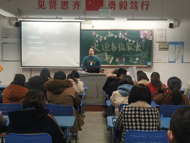 七年级各班班主任精心布置了教室,制作了精美课件。那些温暖的寄语、热情的欢迎词、殷切的鼓励,驱除了冬雨的丝丝凉意,让每一个教室显得春意盎然。家长们都提前到各班教室,有序地签到就座。