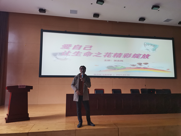 早春三月,春寒料峭。飞龙中学四楼报告厅内却是一派春意盎然。同学们的老朋友吴志伟老师,站在舞台上满脸笑意,侃侃而谈,和同学们积极进行各种互动。针对近年来青少年心理问题频发的现象,吴志伟老师主持了这次题为《爱自己,让青春之花绽放》的团辅活动。在这次活动过程中,吴老师由“斯芬克斯之谜”引入话题,为同学们讲解了生命诞生的过程,肯定了生命的价值,剖析了一些危害生命健康成长的反面案例。吴老师的心理辅导深入浅出,通俗易懂,激起了同学们强烈的共鸣,现场不时暴发出热烈的掌声。