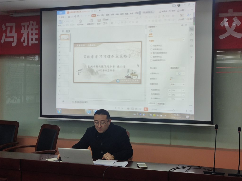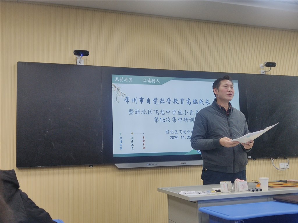 寒风阵阵、阴雨绵绵,2020年11月25日,新北区“盛小青名教师成长营”全体营员在领衔人盛小青主任的带领下,齐聚内外兼修、推贤乐善的飞龙中学,一起参加由潘建明校长引领的常州市自觉数学教育高端成长工作室培训活动。本次培训活动分为教学展示、成员评课、专题讲座3个环节。
