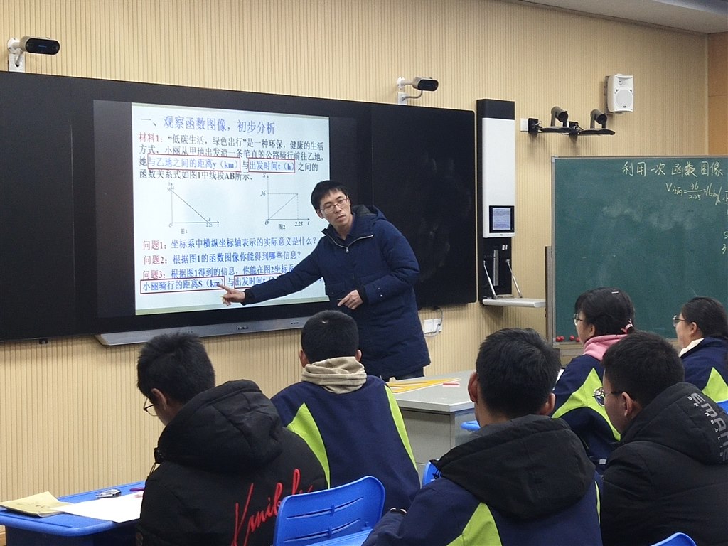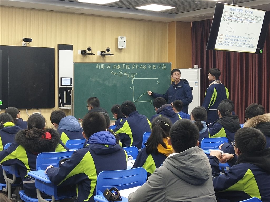 新北区实验中学朱晓玲今天钱程老师开设的这节《利用一次函数图像信息求解行程问题》展示了钱老师扎实的教学基本功,内容设置合理,自然流畅,围绕目标,突出重点,张弛有度!将行程问题蕴含在一次函数中,以图像、文字的形式呈现,涉及面广,灵活性强,对学生分析问题、解决问题的能力要求较高。应用问题的材料和背景大多来自于我们的生活,钱老师通过制作动画的生活场景,调动了学生学习的兴趣,层层递进设计了不同的问题材料和学习任务。从审题到观察图像,分析问题到画图感知,学生经历了借助函数图像解决一类行程问题的过程,归纳出方法,从而培养了由图像来获取信息,提高收集、整理、加工信息的能力。整节课老师教得轻松,学生学得愉快,让每个学生都参与其中,投入到学习中来,促使学生勤于思考和勇于探究,形成良好的学习品质。