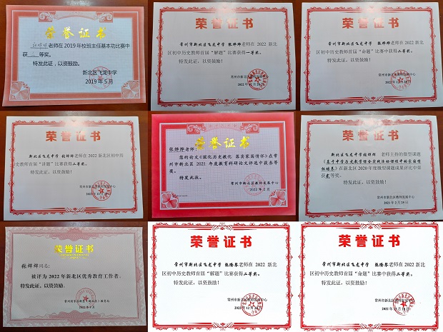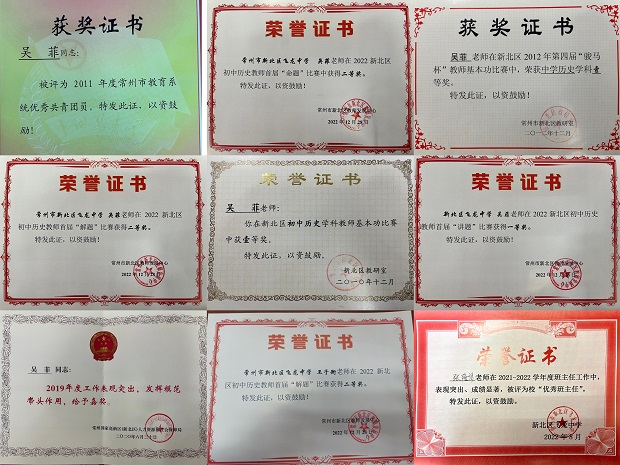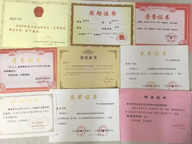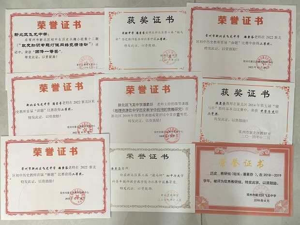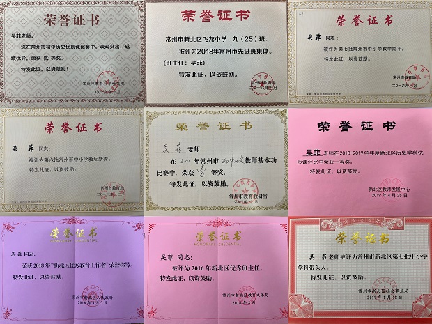 教学上,她孜孜不倦,勤于钻研,努力营造独具特色、轻松愉快而又不失严谨的历史课堂。“情知结合、寓教于乐”的教学风格,深深地吸引学生,曾获得常州市教学基本功一等奖、新北区“骏马杯”比赛一等奖等荣誉。