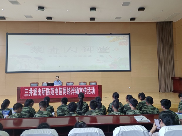 8月25日下午,学生们齐聚报告厅,聆听来自三井派出所的陈警官作《防电信网络诈骗》和《禁毒大讲堂》讲座。讲座中,陈警官结合生活实际,讲述了一些身边的案例,教育学生对防不胜防的诈骗手段提高警惕,也要学会将此类案例普及到家庭中,告知自己的家长防范各类陷阱。来自交警支队的交警们也用精彩的表演和互动,普及道路安全知识,宣传“一人一盔”的必要性,提醒学生们遵守交通法规,保障自己的人身安全。