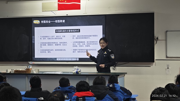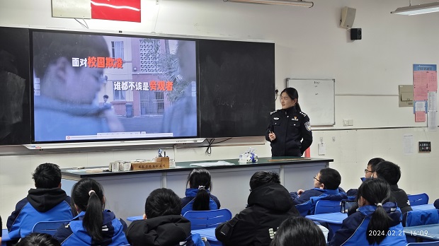 “同学们,你们知道什么是校园欺凌吗?遇到校园欺凌应该怎么办呢?”陈璐警官向同学们介绍了校园欺凌对青少年的危害,以及如何有效预防校园欺凌事件,教育同学们培养健康、正能量的品格,建立融洽的同学关系,积极引导同学们在遇到欺凌时大胆说“不”,并用正确的方法保护自己。
