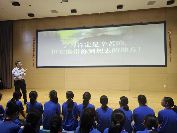 讲座的高潮部分,李老师邀请了部分勇敢的同学上台分享自己的理想和决心。这些同学或慷慨激昂地表达自己对未来的憧憬,或热泪盈眶地诉说着内心的感动与决心。他们的发言引起了在场师生的强烈共鸣,掌声雷动。在李老师的带领下,学生们齐声宣誓:“假如我不能,我就一定要。当我一定要,我就一定能全力以赴!”洪亮的誓言响彻全场,仿佛一股强大的力量在学子们心中涌动。这一刻,掌声如潮,既是对李老师精彩讲座的认可,也是对台上同学勇气的赞赏,更是对九年级学子拼搏精神的致敬。九年级的班主任们也不甘落后,上台为学子们送上最真挚的鼓励和祝福。
