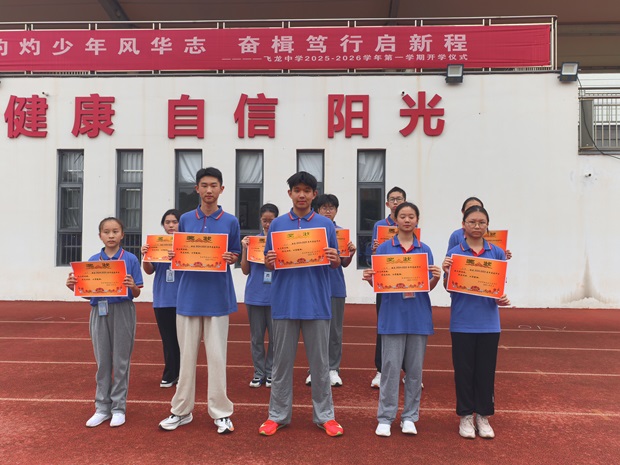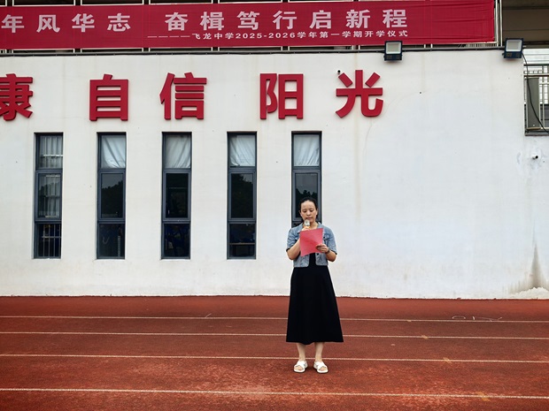 云天收夏色,木叶动秋声。带着对暑假生活的美好记忆,怀着对新学期的憧憬向往,同学们回到了亲切而又熟悉的校园,宁静的校园再次洋溢着青春的活力与求知的热情。9月1日上午9点35分,飞龙中学全体师生齐聚运动场,以“灼灼少年风华志,奋楫笃行启新程”为主题,隆重举行2025-2026学年第一学期开学典礼。