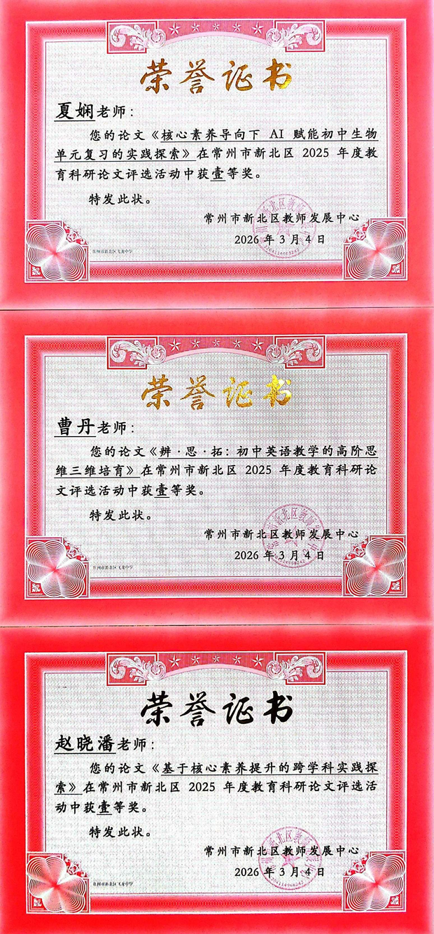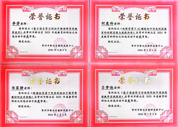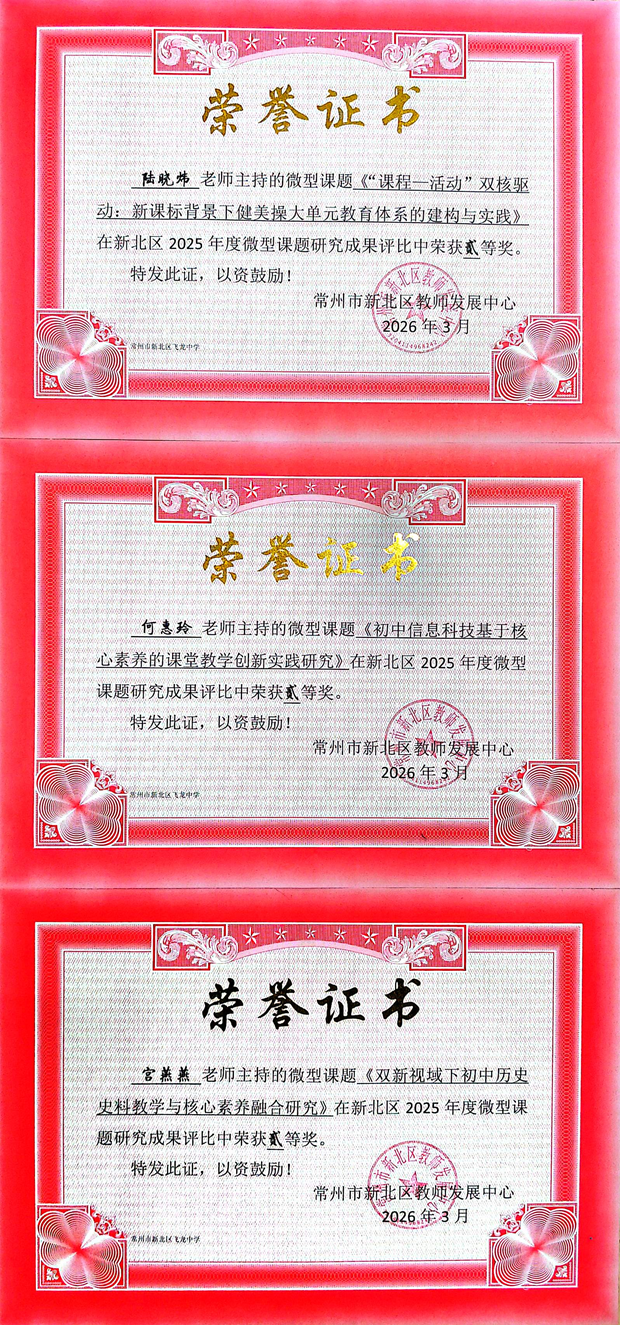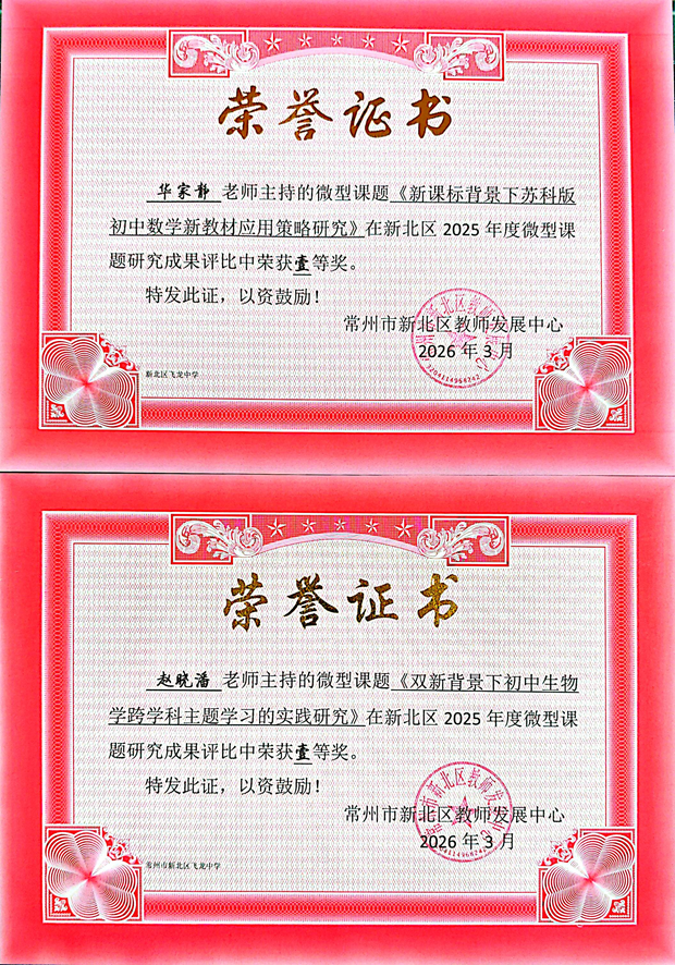 春光明媚,研途芳华。近日,新北区2025年度教育科研论文评选活动、新北区2025年微型课题研究成果评比结果相继揭晓,常州市新北区飞龙中学教师团队凭借扎实的教学研究和丰硕的科研成果,在两项评比中喜获佳绩,充分展现了我校教师深耕教学、精研教育的专业风采。